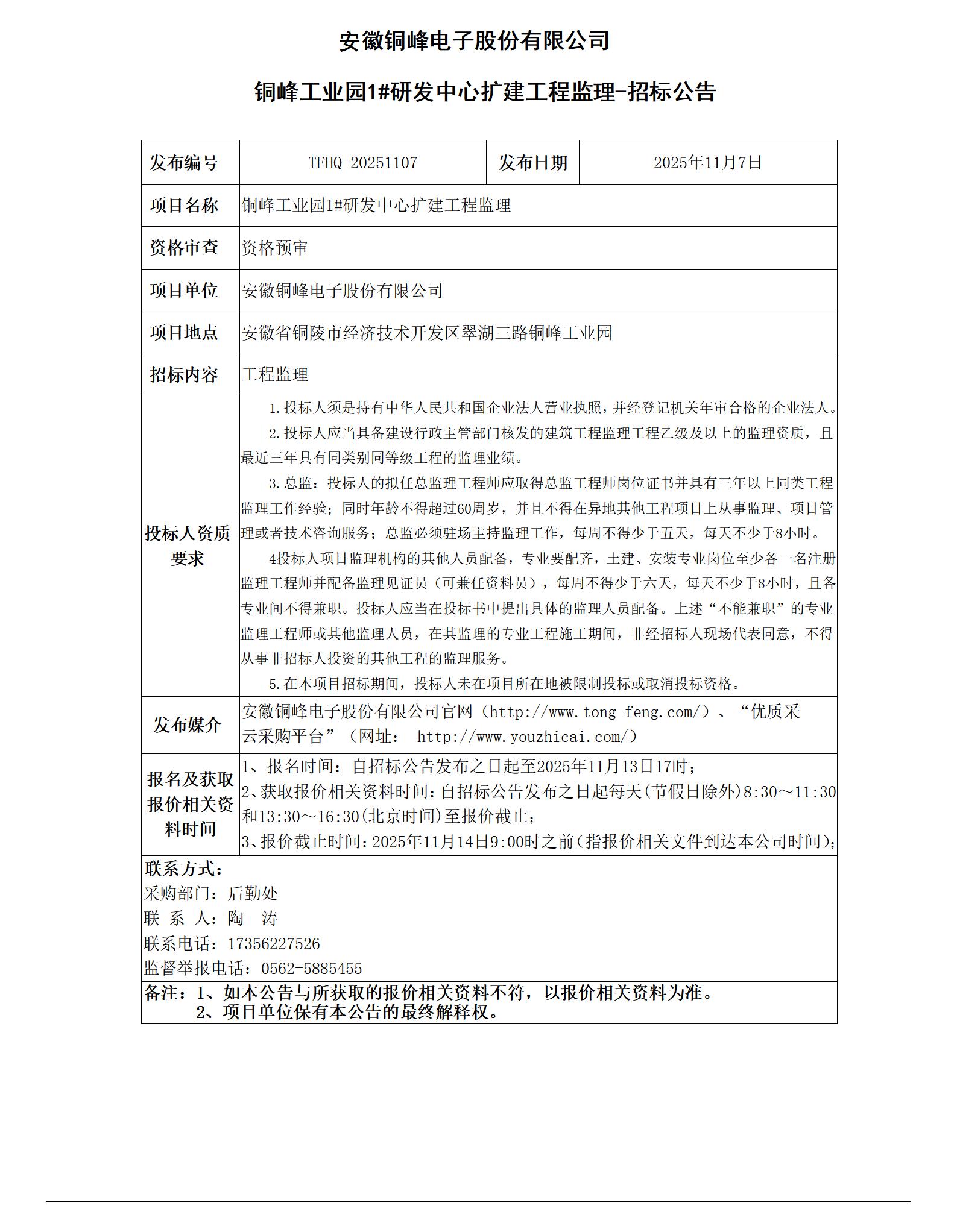 安徽銅峰電子股份有限公司 (銅峰工業(yè)園1#研發(fā)中心擴(kuò)建工程監(jiān)理 招標(biāo)公告)_01