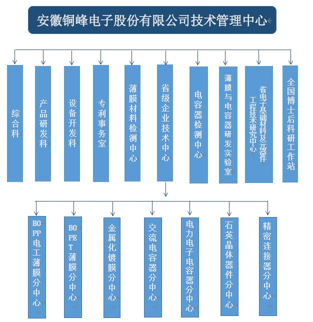 銅峰公司為國(guó)家高新技術(shù)企業(yè)、國(guó)家火炬計(jì)劃重點(diǎn)高新技術(shù)企業(yè)、國(guó)家火炬計(jì)劃銅陵電子材料產(chǎn)業(yè)基地重點(diǎn)骨干企業(yè)。公司建有完整的科研創(chuàng)新組織體系,設(shè)立技術(shù)管理中心作為技術(shù)研發(fā)的總管理機(jī)構(gòu),組織協(xié)調(diào)公司的各分子公司和相關(guān)部門,以確保公司技術(shù)創(chuàng)新精確高效地運(yùn)行。技術(shù)管理中心下設(shè)綜合科、產(chǎn)品研發(fā)科、設(shè)備開(kāi)發(fā)科、專利事務(wù)室、薄膜材料檢測(cè)中心、電容器檢測(cè)中心以及薄膜與電容器研發(fā)實(shí)驗(yàn)室,同時(shí)下設(shè)省級(jí)企業(yè)技術(shù)中心、安徽省電子基礎(chǔ)材料及元器件工程技術(shù)研究中心以及國(guó)家級(jí)博士后科研工作站。