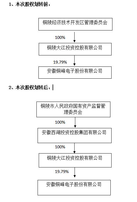 安徽銅峰電子股份有限公司(以下簡稱“本公司”或“公司”)于 2022 年9月16日收到控股股東銅陵大江投資控股有限公司(以下簡稱“大江投資”)的通知,為優(yōu)化國有資產(chǎn)配置,經(jīng)銅陵市人民政府批準(zhǔn),擬將公司實際控制人銅陵經(jīng)濟技術(shù)開發(fā)區(qū)管理委員會(以下簡稱“銅陵經(jīng)開區(qū)管委會”)持有的控股股東大江投資100%股權(quán)劃轉(zhuǎn)至安徽西湖投資控股集團有限公司(以下簡稱“西湖投資”)。2022 年 9月16日,銅陵經(jīng)開區(qū)管委會與西湖投資已就本次國有股權(quán)劃轉(zhuǎn)事項簽署了《關(guān)于銅陵大江投資控股有限公司之股權(quán)無償劃轉(zhuǎn)協(xié)議》。上述股權(quán)劃轉(zhuǎn)事項尚需辦理工商變更手續(xù)。